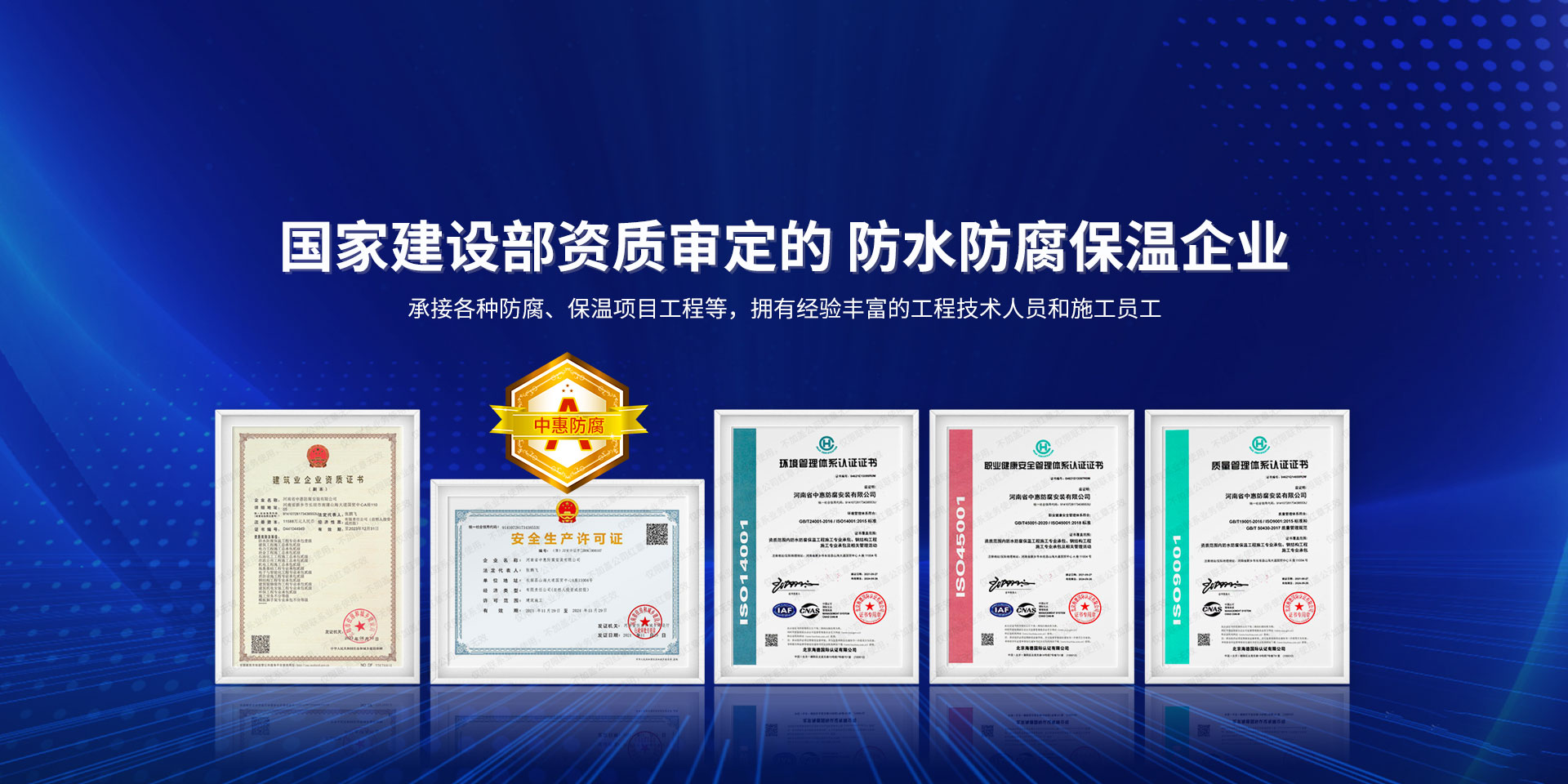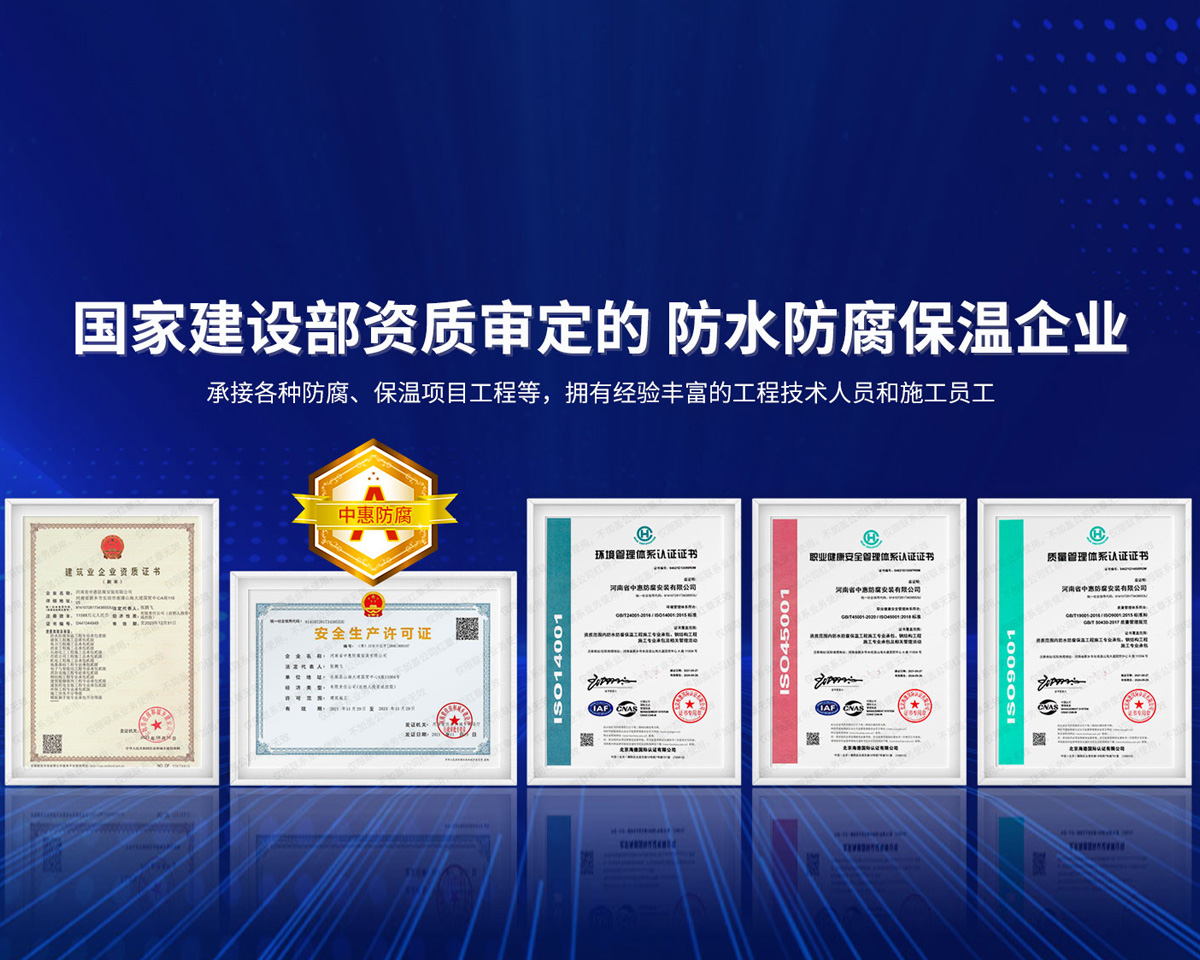 公司經營范圍:防水防腐保溫工程;消防設施工程;建筑裝修裝飾工程;建筑機電安裝工程;電力工程;建筑工程;石油化工工程;工業清洗工程;油罐清洗工程;鋼結構工程;環保工程;模板腳手架工程;電纜防火封堵、防污閃噴涂、外墻外保溫工程;各類施工勞務作業;設備維修、船舶鉚焊、涂裝;電力工程材料、建材、防水材料、防火材料、防腐保溫材料銷售,并相繼通過了GB/T19001-2008idtISO9001:2008GB/T50430-2007質量管理體系認證證書。GB/T24001-2004idtISO14001:2004環境管理體系認證證書。GB/T28001-2011idtOHSAS18001:2007職業健康安全管理體系認證證書。公司是中國防腐蝕于防護協會、中國施工企業管理協會、電力協會和中國鋼結構防水協會會員單位。 公司的經營業務涵蓋了石油、化工、電力、冶金、煤炭、船舶、國防、燃氣、水利、環保、交通運輸、航空及國防軍工和輕紡市政等行業的防腐保溫絕熱設備。鋼結構安裝、防火、防水、金屬噴鍍、聚脲噴繪、陰極保護、防滲透堵漏、玻璃鋼及各種磚版材料襯里、橡膠襯里、煙氣硫和耐酸溶劑腐蝕等工程施工。公司連續十年榮獲“省市先進施工企業”“安全生產先進單位”“重合同,守信用企業”和“AA***資質企業”的稱號。2000年被命名為市級文明單位,2002年被國家工商行政管理局命名為“重合同,守信用的企業”、被中國工業防腐蝕技術協會命名為“防腐蝕企業,能源節約及環境保護領域有豐富的經驗和***的業績。工程一次交驗合格率100%。其中攀枝花鋼鐵公司煉鐵廠四號高爐及熱風爐防腐工程、上海寶鋼公司煤氣柜防腐工程、撫順石油一廠裝置防腐項目、齊魯石化公司稀烴廠高塔防腐工程、吉林化學工業公司煉油廠油罐防腐工程、天津石化熱電廠六號爐頂棚聯絡管保溫工程、大慶油田(太倉)力神泵業工程、中國化學工程第十一建設工程、中原油田勘探局工程、中國石化銷售有限公司華北分部、魯皖輸油管道工程、貴州開磷息烽合成氨工程、陜西黃陵煤化工程、中國石油天然氣西部管道塔里木輸油工程、邯鋼集團邯寶鋼鐵公司煉鐵工程、德州供電工程、吉寶(南通)船廠工程,偃師華潤熱力工程、鄭州熱力總公司。 河南省中惠防腐安裝有限公司愿以豐富的施工經驗,***的技術,***的設備,***的管理,***的服務,竭誠為國內外廣大的用戶提供***滿意、******的工程作品。 我公司愿與國內外同仁一道,團結協作,共同推進防腐蝕行業發展! 公司地址:河南省長垣縣建設路北段360號 固定電話:0373-8866488 郵編:453400 網址:http://www_zhff_com_cn.18720068777.com